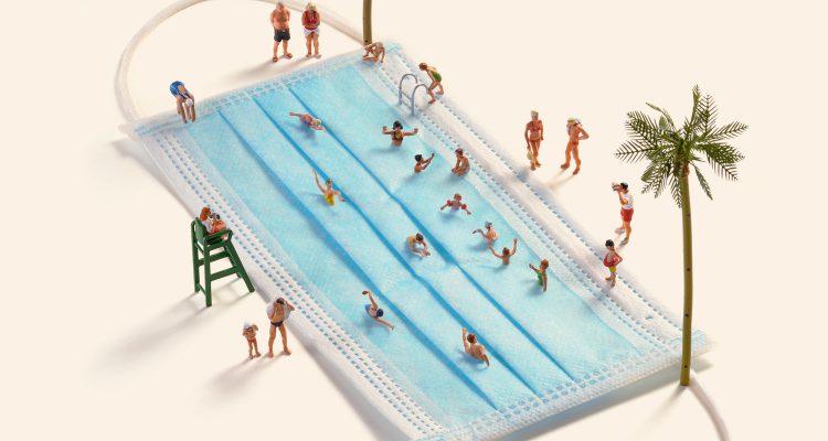 Da sempre l’artista e fotografo giapponese Tatsuya Tanaka decontestualizza i piccoli oggetti di uso quotidiano e gli crea intorno un paesaggio fantasioso e spesso surreale. Per questo le maschere facciali usa e getta, in grande evidenza in tempi di Covid, finiscono protagoniste in piccoli set di simpatiche avventure all’aria aperta. Una maschera piegata funge da piccola tenda, un’altra viene usata come piscina o come rete per una partita di pallavolo…Il suo Miniature Calendar, una serie che raccoglie dei diorami in miniatura ispirati alla vita quotidiana, rilegge il significato anche di altri oggetti come carta igienica e termometro e gli dona un senso nuovo e beffardo.