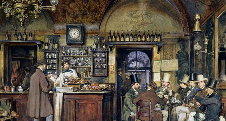 I Caffè storici hanno contribuito a cambiare la scena culturale in giro per l’Europa. Il parigino Caffè Procope è considerato il più antico caffè letterario del mondo (ha aperto nel 1689). Il suo nome resta indissolubilmente legato all’Encyclopédie di Diderot e ha visto discutere a quegli stessi tavoli Voltaire e Rousseau. I caffè storici viennesi sono stati nominati dall’Unesco patrimonio immateriale dell’umanità dato che “trascendono la loro funzione”, sono ancora oggi, i centri della vita sociale di una parte della cultura europea. Al Central, borghese e in stile neo-rinascimentale, ci andava a giocare a scacchi un medico, tale Freud… Sui Caffè spagnoli, francesi, austriaci, sui coffeehouses inglesi esiste una robusta e interessante bibliografia. Ora Massimo Cerulo con Andare per caffé storici (Il Mulino, pag.152, euro 12) ci invita a un viaggio in alcuni dei più celebri Caffè storici italiani (Florian, Pedrocchi, Al Bicerin, Tommaseo, Le Giubbe Rosse, L’Antico Caffé Greco, Gambrinus, per citarne solo alcuni) in un percorso che si snoda da Nord a Sud, in otto città partendo da Venezia per poi toccare Padova, Torino, Trieste, Firenze, Roma, Napoli, Cosenza. Come diceva Eduardo Galeano: frequentando i vecchi Caffè si impara a raccontare. Per Cerulo in questi luoghi «si apprende anche la storia della società in cui si vive. Perché i Caffè, quelli storici in particolare, rappresentano scrigni di memoria collettiva che permettono di comprendere come si sia arrivati al presente. Attraverso quali discorsi, conversazioni, forme di lotta e militanza, manifestazioni artistiche e culturali». (In apertura Artisti nel Caffè Greco a Roma, 1856 di Ludwig Passini).
