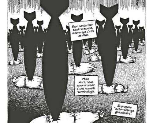 Miscelando critica e umorismo nero, il fumettista e giornalista maltese-americano attacca duramente il governo degli Stati Uniti, accusando l’ex amministrazione Biden di complicità nel genocidio. Sottolinea sarcasticamente i “valori condivisi” tra America e Israele disegnando soldati americani che alzano il pollice davanti a cadaveri ammucchiati come legna da ardere. Celebre per i suoi reportage approfonditi sulla Palestina, Sacco è stato costretto questa volta a lavorare a distanza e non ha gradito. «Come altri artisti o scrittori, vedo la scrittura e il disegno come una forma di pensiero: cominci e improvvisamente le idee cominciano a fluire. All’inizio è stato difficile perché non amo particolarmente scrivere articoli di opinione. Preferisco il reportage, ma in questo caso non avevo altra scelta». War on Gaza non è il risultato di un resoconto dettagliato e di prima mano (l’esercito israeliano non ha mai lasciato entrare nella Striscia di Gaza i giornalisti), piuttosto è un distillato di fatti e cifre, così come sono stati assemblati nel corso del tempo nel quale la guerra si è sviluppata: conteggi delle vittime, immagini di insostenibile violenza, presentate con un’urgenza martellante che non si ferma per riprendere fiato durante tutte le 32 pagine dell’opera.