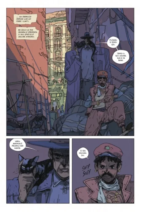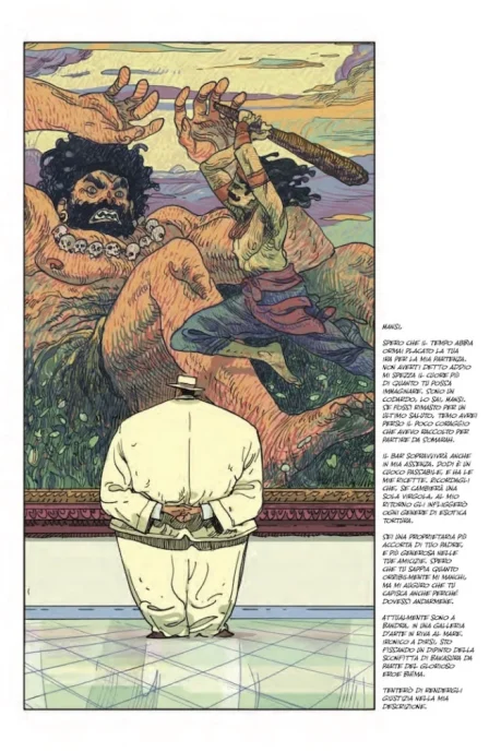 Il passo della storia è proprio quello. Lento ma disteso, piacevole, rilassante e rassicurante. La gente viene uccisa e mangiata, per lo più fuori scena ma è chiaro che questo fatto ha luogo eppure non è l’inquietudine il sentimento che prevale nel corso della lettura. L’effetto è quello che si ottiene guardando un video in cui qualcuno cucina un piatto goloso, con una punta di malinconia perché insieme alle ricette vengono raccontate vicende umane agrodolci, storie d’amore e di dolore, di lutto e di gioia. A dettare i tempi della narrazione è Rubin, un corpulento e malinconico esteta del gusto che vuole lasciare al mondo il suo testamento spirituale e che per farlo non si fa particolari scrupoli, un manipolatore decadente ma con un suo fine non privo di una certa nobiltà. La lentezza stanca e voluttuosa al tempo stesso sembra emanata direttamente dal suo corpaccione che attraversa l’India senza fretta, dispensando storie e consigli culinari che mostrano quanto il cibo sia cultura. Il tratto di Filipe Andrade è caldo, morbido e poco nitido, adatto a raccontare una cultura che del caos ha fatto la propria cifra, cultura ricca di elementi profondamente eterogenei che convivono in un umano che in qualche modo le fonde tutte insieme in un sapore diverso, ottenuto dalle sue componenti che però sembrano non distinguersi più. L’aggettivo inconsueti presente nel titolo definisce bene un’opera che porta il pastiche su un livello di naturalezza una spanna più alto rispetto alla media di un fumetto che ha fatto della metanarrazione una pratica stanca e ripetitiva. Ram V rimonta la macchina che altri hanno smontato e la fa ripartire con una freschezza e una levità rare.