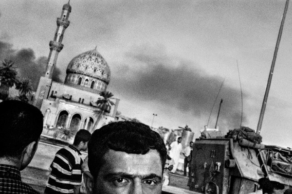 Terre spezzate. Il grande caos del mondo arabo (Contrasto, pag.220, euro 22), è la versione integrale e ampliata del reportage di Scott Anderson e Paolo Pellegrin. Il reportage è stato prodotto per il New York Times, che lo ha pubblicato il 14 agosto 2016 in un numero speciale del magazine interamente dedicato. Il quotidiano La Repubblica nello stesso giorno ha riservato ben 32 pagine allo stesso servizio. Entrambe le pubblicazioni hanno rappresentato una nuova modalità di inchiesta, mai realizzata prima con questa ampiezza, che ha segnato un riferimento assoluto e da quel momento imprescindibile di eccellenza giornalistica. Dall’aprile 2015, lo scrittore Scott Anderson e il fotografo Paolo Pellegrin hanno intrapreso una serie di lunghi viaggi in Medio Oriente. Avevano già documentato, separatamente e insieme, un ampio ventaglio di conflitti avvenuti in quella regione nel corso dei precedenti vent’anni. La speranza in questa nuova serie di viaggi era acquisire una maggiore comprensione della “Primavera araba” e del suo seguito, generalmente tetro. Quando la situazione continuò a deteriorarsi nel corso del 2015 e del 2016, i loro viaggi si sono estesi alle isole della Grecia – che sostenevano il peso maggiore dell’esodo di migranti dall’Iraq e dalla Siria – fino alla linea del fronte dell’Iraq settentrionale, dove la battaglia contro l’Isis era combattuta più intensamente. Il libro Terre spezzate presenta il risultato di questo progetto sotto forma di sei racconti individuali dal Kurdistan alla Libia che, intrecciati con i fili più spessi della storia, compongono un vivido arazzo di un mondo arabo in rivolta: 1972-2003 Le origini, 2003 2011 La guerra in Iraq, 2011-2014 Primavere arabe, 2014-2015 L’ascesa dell’Isis, 2015-2016 L’esodo, 2016 Epilogo. Nell’immagine di apertura: Iraq 2003. Un gruppo di civili fugge da Bassora a causa dell’intensificarsi degli scontri tra le forze della coalizione e i lealisti di Saddam. Qui sotto: Iraq 2003. Una protesta a Baghdad contro la presenza delle forze di invasione statunitensi.