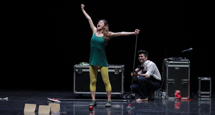 Non c’è una trama in questa drammaturgia elementare ed essenziale, eppure criptica e profetica, in cui vediamo più un moto dipanarsi, un uni-verso esprimersi, attraverso le sue tracce sparse, dove spesso parla più il corpo, mimico, danzante, giocoso, indecifrabile, nell’incontro/contrappunto fatato del moto espressivo della danzatrice Valia La Rocca e della voce invocante e dolente dell’attore Isacco Venturini, un’Eva e Adamo irrequieti e ludici, separati eppure all’unisono, disfunzionali in cerca di un’armonia mai posseduta. Più che il testo che pure invoca appelli senza risposte e domande al vento, parlano i corpi, gettati nell’universo, le voci incapsulate dal microfono e lanciate nel cosmo, gli oggetti reinventati, i passi di danza come ripetizione e liberazione, il linguaggio dei segni come mistero e potenza del linguaggio… Interessante che l’unica ipotesi di ricongiungimento fra i sessi esiliati/distanziati dall’hybris della curiosità e dalla violenza dell’essere gettati sempre altrove, squilibrati, sia all’insegna del tentativo di inscatolamento maschile e della conseguente contorsione ed escapologia femminile.