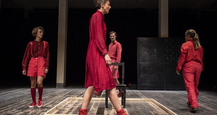 Gli interpreti adulti/bambini indossano varie tonalità di rosso, con un po’ di rosa, ma evitando a tutti i costi l’idiota demarcazione rosa / azzurro (l’applicazione cromatica e più immediata di ciò che Mieli indicava nella “Norma”). La prima ad entrare in scena è Anna Resmini, che si dichiara subito non primariamente attrice (è infatti illustratrice: qui i suoi lavori). Col gesso su una lavagna d’ardesia traccia con precisione i numeri che compongono un quadrato magico. Insieme ai tre compagni, cerca una sistematizzazione, un ordine, se pur sconvolgente, magmatico, del sé. Tutti si pongono domande semplici, “da bambini”, cioè le più scomode e difficili a cui rispondere. Anche scoprendosi e toccandosi, come fanno i bambini. Spesso in movimento – dentro e fuori – da una cornice quadrata di legno e nel perimetro quadrato del palco, di volta in volta chi tra i quattro prende la parola, tenta, da domande complesse, di estrarre deduzioni semplici, come “la normalità esclude, la verità comprende”. Immagini che sono verità lampanti, come l’abbraccio oscillante, indistinto del “mare che separa e unisce le due sponde”, mentre dal “periodo Sinatra” di Mina sulla scena risuona la marea accogliente di Ebb Tide. Nonostante l’urgenza di scoprirlo o rileggerlo, soprattutto per ciò che dice sul legame tra desiderio e capitale (nel senso di Marx) e la ricorrenza dei 50 anni del F.U.O.R.I.!, che Mieli contribuì a fondare, di Elementi non si sente parlare molto. O meglio: del personaggio fuori da ogni schema, della sua eccentricità – l’essere molto oltre le orbite tracciate – sì (come nel film Gli anni amari di Andrea Adriatico, qui la recensione di Fabio Vittorini). Delle sue idee, meno. Ecco perché è bello veder riemergere, dalla stessa lavagna dell’inizio, dopo alcune necessarie cancellature, un suo ritratto a testa in giù. Come uno spirito alieno, venuto a capovolgere il nostro punto di vista. La cui intelligenza viva, pungente, eretica, non si esaurisce in un fulmineo transito terrestre. Ideato, messo in scena e prodotto da Irene Serini, Caterina Simonelli, Anna Resmini, Luca Oldani, Christian Tubito, Maurizio Guagnetti, Compagnia IF Prana, con il sostegno di residenza artistica Olinda e Teatro della Tosse (con primo spettatore Fabio Cherstich), Abracadabra – L’educazione del bambino e della bambina – #studio5 come si diceva sopra, è il compimento di un ciclo di cinque performance indipendenti (le prime tre con Irene Serini in monologo, la quarta in dialogo con Caterina Simonelli).
