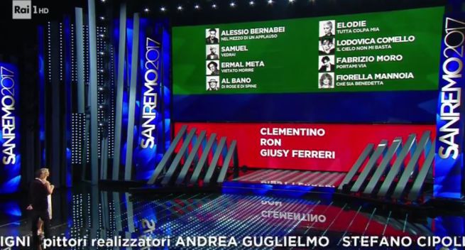 Partenza: clip iniziale interminabile con medley dei grandi successi non vincitori degli ultimi 50 e rotti anni (con Dalla, Battisti, Celentano etc.). Un bel modo per ricordare che sovente hanno trionfato i peggiori. Autogol al primo minuto: roba che neanche Alvaro Pereira in Copa America. Voto: 1