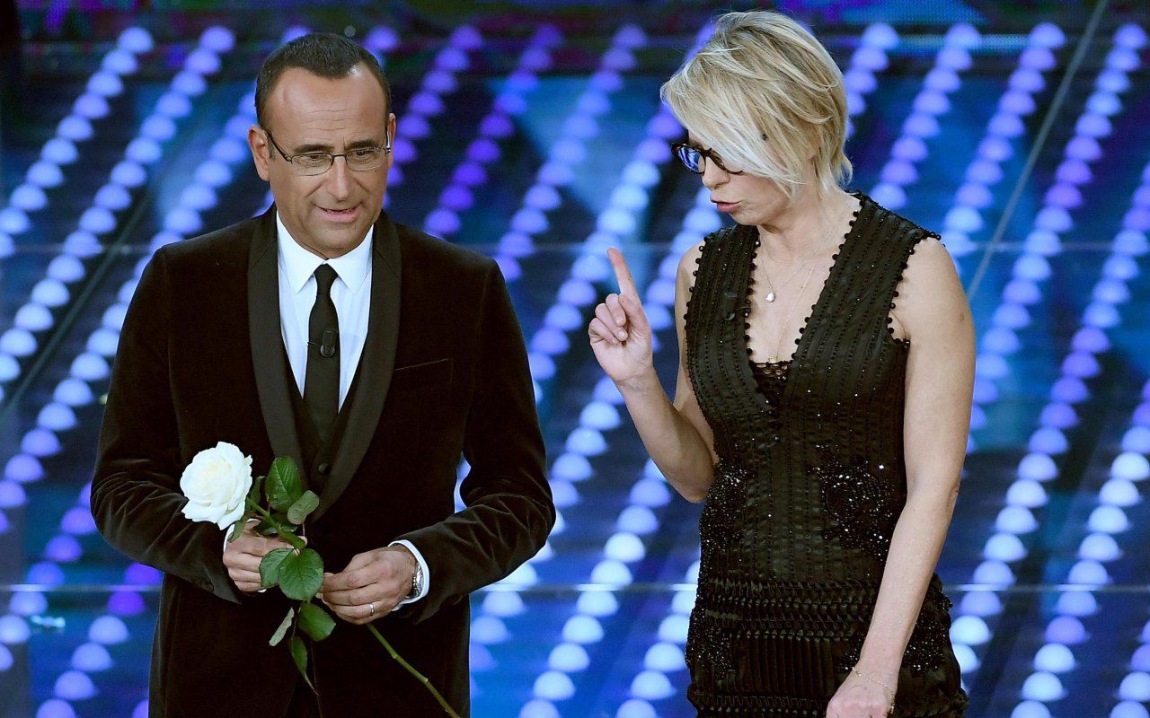Carlo e Maria: lui abito nero su carnagione nera; lei abito nero su carnagione nivea. Sembrano Wess e Dori Ghezzi 2.0. Lui, che comunque è un professionista ineccepibile e transsociale, non ha mai in ogni caso brillato per ritmo. Lei, regina dell’understatement, entra senza scendere le scale (ché sulle scale è abituata a sedercisi, e infatti gli autori le scrivono la battuta ad hoc) e il