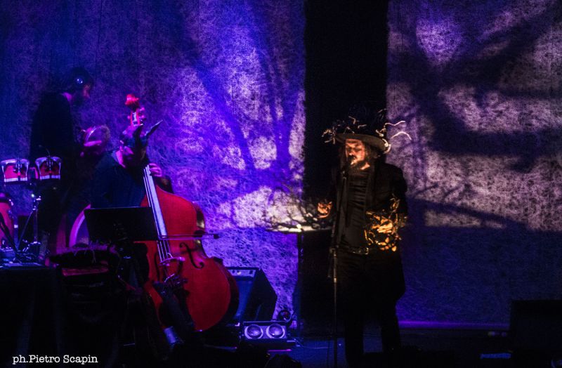 Vieni accolto dal suono di uccelli notturni, il verso stridulo e ipnotico della civetta (o è il barbagianni?), un gracchiare lontano. Anche i suoni si fanno ombre incerte. Quando si spengono le luci del teatro, pare quasi di essere in un sogno notturno a occhi aperti, in una boscaglia illuminata a mala pena. Luminescenze come fumi filiformi, ombre e penombre ti fanno capire che Vinicio e la sua ghenga sono saliti sul palco. A volte non è chiaro dove stia il “frontmàn”: dietro un telo-schermo, al pianoforte, nella luce bianca dell’occhio di bue. Poi di nuovo dietro il telo in forma di ombra a dialogare con la sua stessa ombra (quale delle due ha corpo vivo?), a scherzare con l’icona di sé e delle silouhette-copertine dei suoi dischi. Infine a proiettare accecanti bagliori di specchi verso il pubblico. Dopo Polvere, Ombra. Il tour invernale di Vinicio Capossela è imbastito a partire dal secondo album del doppio Canzoni della Cupa, ma anche dall’immaginario del libro (e film) Il paese dei Coppoloni e dalle Ombre radio (racconti per la stagione intercalare) passate su Radio3 prima di Natale (http://www.rai.it/dl/portaleRadio/media/ContentItem-034052e9-a656-43e6-9e95-8f1087a8f0b5.html). Contraltare al chiasso assolato e folkloristico del primo atto, è questa l’anima live (and in person) più magica e destabilizzante dell’autore, quella in parte meno festosa, ma abissalmente intima, inquieta e malincolica (la “L” non è un refuso), anche quando imbevuta di rock (Scorza di mulo, La bestia nel grano).«Nella notte di luna, nella luce di luna» bisbiglia quasi Capossela ne Il Pumminale, canzone dedicata a una creatura mitologica, lupo mannaro in versione campana, uomo-bestia o anima-corpo simbolo di ogni inadeguatezza «il lupercio mannaro di dentro, che la notte non lascia stare, che invece di lupo l’ha trasformato in porco maiale…».