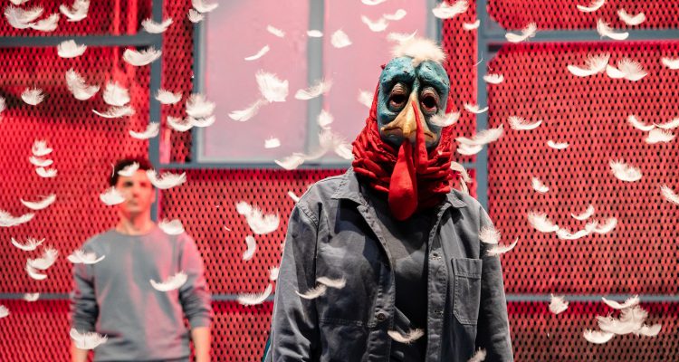 Il lockdown come occasione perfetta per rispettare l’unità di luogo della tragedia classica, come spazio (fisico e mentale) per replicare/rivivere la paralisi novecentesca del teatro dell’assurdo. Aspettando Glovò, si potrebbe così dire, giocando ma non troppo con i nostri tempi, in cui l’attesa (messianica, teologica, metafisica) sembra prendere la declinazione più meschina, consumistica ed effimera di un acquisto online, il cui annuncio passa per la banale chiamata al citofono. Ed Emanuele Aldovrandi, astro nascente della drammaturgia italiana, sceglie di mettere in scena la pandemia e il confinamento quasi in presa diretta, registrando/restituendo/rimontando con abilità e orecchio il gioco al massacro contemporaneo attraverso le forme del grottesco e virate surreali, con il ritmo giocoso della commedia e l’eco della satira sui cliché ripetuti e incastrati su noi stessi. In un ceruleo dipinto di ceruleo (scene di Francese Fassone e costumi di Costanza Maramotti secondo un bigio monocromatico un po’ The Truman Show, un po’ carcerario), due uomini, e poi due coppie, s’incontrano e si scontrano in quell’ora d’aria sospesa e vuota che si dà in un cortile condominiale ai tempo del contagio, gabbia per volatili che circoscrive la libertà di un’umanità mutante, uomini che rischiano di diventare tacchini (e far la loro fine?), assemblea condominiale di uomini soli e incattiviti, resa dei conti dell’umanità, interrotta solo da fattorini di scatole mai aperte.