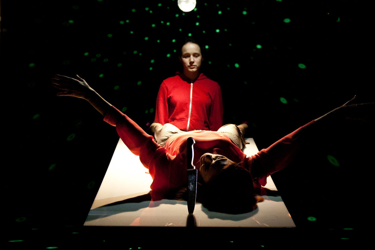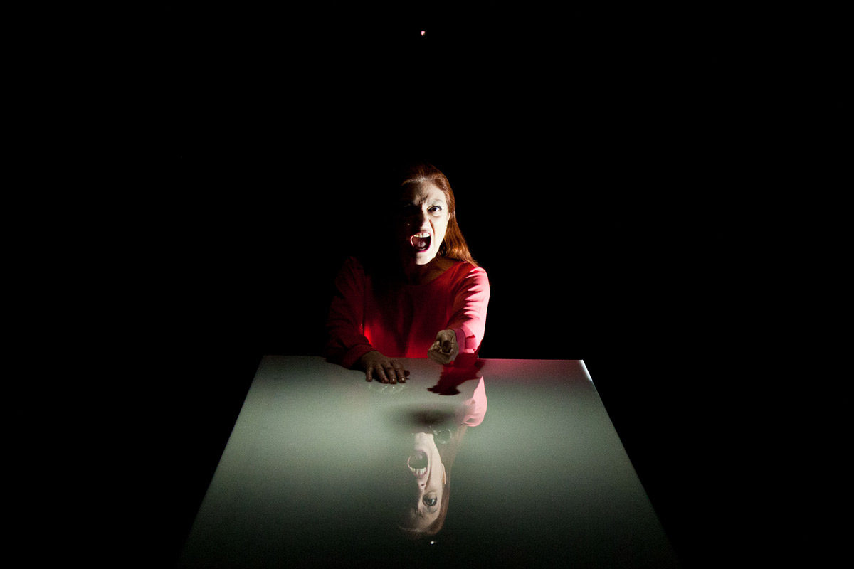 La scena è volutamente scarna: seduta davanti a un tavolo che sembra quello di un macello, su cui è conficcato un coltello di grandi dimensioni, una donna (Annina Pedrini, perfetta nel ruolo) racconta la sua storia, fatta di grandi aspettative e di cocenti delusioni, fino al tragico epilogo che ha appena avuto luogo. Nelle sue parole, passato, presente e futuro si confondono, i contorni non sono nitidi e i ruoli si invertono.