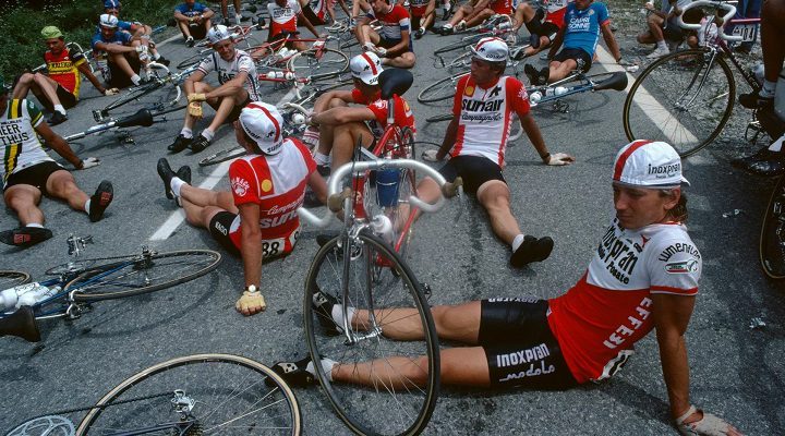 Fango, passione, fatica, drammi, sconfitte, vittorie, in una parola: ciclismo. Sono queste le coordinate della mostra, curata da Marco Minuz, Vite di corsa che si può visitare al Castello di Caldes (Tn) fino al 26 settembre. Uno straordinario racconto in cui lo sguardo dei grandi fotografi dell’agenzia Magnum esplora la grandezza e il mistero del ciclismo. Una storia per immagini che non si limita a testimoniare le gesta dei campioni e le grandi corse come il Tour de France, ma anche la quotidiana umanità del mondo a due ruote. Un percorso inedito di 80 immagini (molte delle quali mai prima esposte al pubblico) che a differenza della tradizionale fotografia sportiva, racconta il ciclismo attraverso la sensibilità e l’ironia di questi autori, in un percorso a tappe che comincia dalle fotografie realizzate da Robert Capa nel 1939 e arriva fino ai giorni nostri, attraverso l’obiettivo di Alex Majoli. Le immagini selezionate dall’archivio Magnum mostrano così splendidi reportage dedicati al mondo del ciclismo e sono testimonianza delle caratteristiche che accomunano questi fotografi: l’incontro fra esigenza artistica e reportage, con un’attenzione speciale per la dimensione umana. Così si può andare oltre le gesta sportive e porre l’attenzione sul mistero del ciclismo, l’unico sport come amava ripetere Gianni Mura, dove “chi fugge non è un vigliacco”. (In apertura i ciclisti attendono mentre gli organizzatori del Tour negoziano con gli agricoltori in protesta per rimuovere i loro trattori dalla strada. Tour de France, 1982. Foto di Harry Gruyaert).