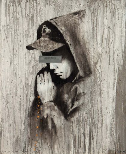 All’interno di questo percorso, la mostra riserva un focus speciale ad alcuni capolavori, fra cui una delle opere uniche più potenti di Banksy: Forgive Us Our Trespassing. Ideata nel 2010 con un gruppo di studenti d’arte di Los Angeles e originariamente realizzata sul muro di una chiesa a Salt Lake City, l’opera ritrae un giovane writer in ginocchio, con le mani giunte in preghiera. Gli occhi del ragazzo sono coperti da una banda scura, simbolo di censura e anonimato. Tra sacro e profano, ribellione e redenzione, Banksy si interroga sul confine sottile tra arte e vandalismo, libertà creativa e necessità di regole. È una preghiera silenziosa che diventa resistenza, un atto fragile e al tempo stesso universale.