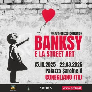 Fino al 22 marzo 2026 a Palazzo Sarcinelli di Conegliano (Tv), c’è la possibilità di visitare la mostra BANKSY e la Street Art. La rassegna propone 80 opere per approfondire uno dei linguaggi più incisivi, provocatori e amati della contemporaneità. Curata da Daniel Buso, la mostra è organizzata da ARTIKA in collaborazione con Deodato Arte e con il Comune di Conegliano. Il percorso della mostra è concepito come un viaggio in più capitoli – Ribellione, Pacifismo, Controllo e propaganda, Consumismo – che insieme raccontano le anime contrastanti e complementari della Street Art. Ogni sezione è un frammento di un discorso più ampio: quello di un’arte che, nata ai margini, ha saputo trasformare i muri delle città in specchi del nostro tempo. Dalla ribellione originaria – che trova voce nei tratti immediati di Keith Haring e nelle provocazioni di Banksy, Blek le Rat e Invader – emerge l’urgenza di affermare la libertà creativa contro ogni forma di controllo. In questo impulso si innestano le prese di posizione dell’arte urbana di fronte ai conflitti armati. Molte opere, infatti, mettono in risalto un’intenzione pacifista e dissacrante capace di ribaltare la retorica bellica, dall’ironia tagliente di Banksy al bacio tra militari di TvBoy. In apertura Napalm (2004), serigrafia su carta – © Banksy.