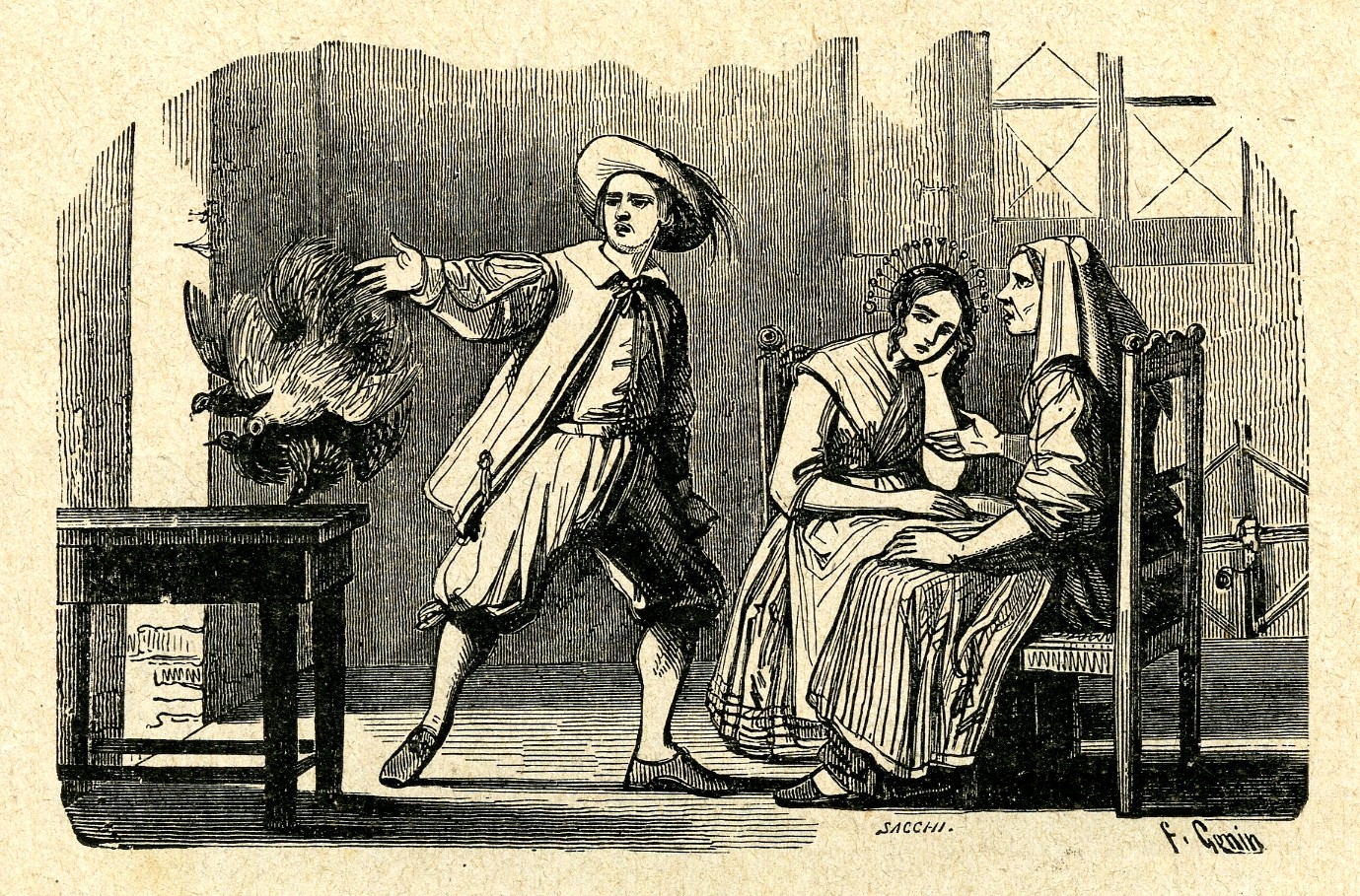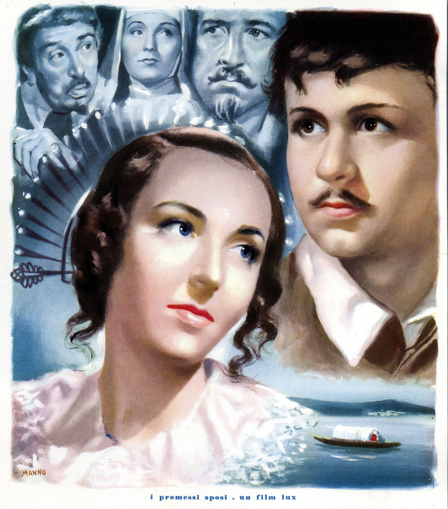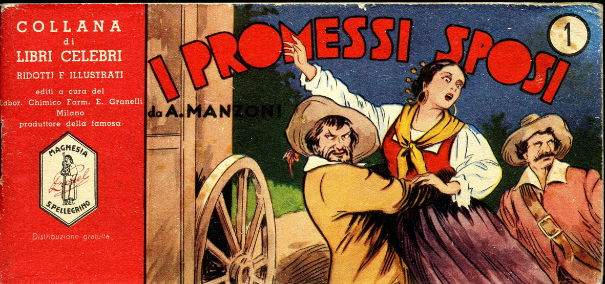 Alessandro Manzoni per l’edizione definitiva del suo romanzo, cerca con convinzione un illustratore di talento e adatto per completare l’opera narrativa. Lo trova finalmente nel giovane artista torinese Francesco Gonin, che realizza una quantità di illustrazioni senza precedenti. Gonin lavora a stretto contatto con Manzoni, realizzando centinaia di immagini che raccontano ogni momento importante del romanzo, con straordinaria aderenza al testo e di perfetto supporto a questo, in un’impaginazione diretta dallo scrittore stesso. La primissima versione a fumetti de I Promessi Sposi, non nasce per una rivista venduta nelle edicole: viene realizzata nel 1953 da Domenico Natoli per un piccolo albo “a striscia” sponsorizzato dalla Magnesia San Pellegrino e viene regalato nelle farmacie. Solo due anni dopo, nel 1955, una seconda versione del romanzo viene pubblicata sulle pagine de Lo Scolaro, settimanale genovese di ispirazione cattolica, che si rifà soprattutto al film diretto da Mario Camerini nel 1941. L’intento educativo è evidente, dato che in calce alle tavole a fumetti (senza nuvolette, ma solo con didascalie) vengono pubblicati dei passi scelti del romanzo. La trasmissione dello sceneggiato I Promessi Sposi, nel 1967, è un grande evento che incolla al teleschermo oltre 18 milioni di telespettatori. Un kolossal del genere riaccende l’attenzione sul romanzo di Manzoni, e infatti vedono la luce in contemporanea due diverse iniziative ispirate al romanzo: un nuovo adattamento a fumetti firmato da Michele Gazzarri e Sergio Zaniboni e un album di figurine allegato al Corriere dei Piccoli, illustrato da Aldo Di Gennaro e Bruno Faganello. L’album propone alcuni brevi passi del romanzo con illustrazioni in cui i volti dei personaggi sono gli stessi del piccolo schermo: Nino Castelnuovo, Paola Pitagora, Luigi Vannucchi, Salvo Randone… La versione di Gazzarri e Zaniboni invece, pur uscendo insieme allo sceneggiato, non si richiama ad esso, anche se sulla copertina i volti dei protagonisti sono incorniciati da uno schermo televisivo.