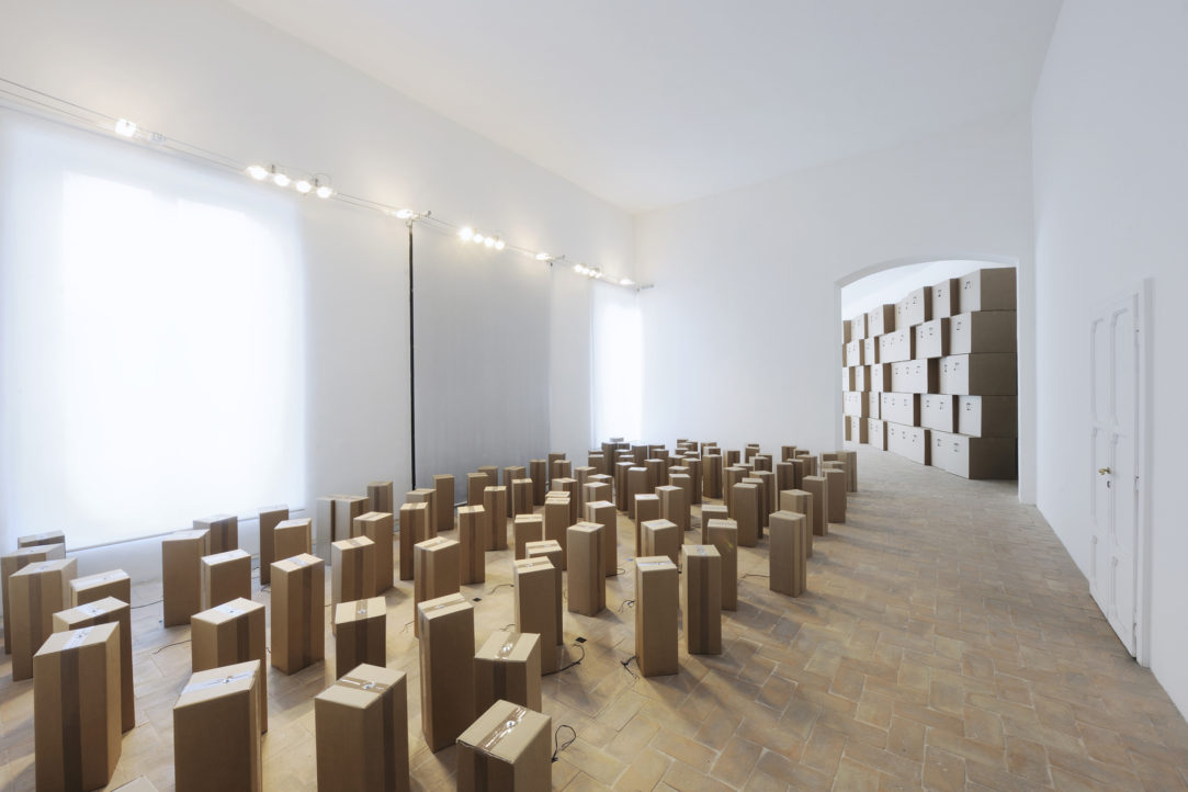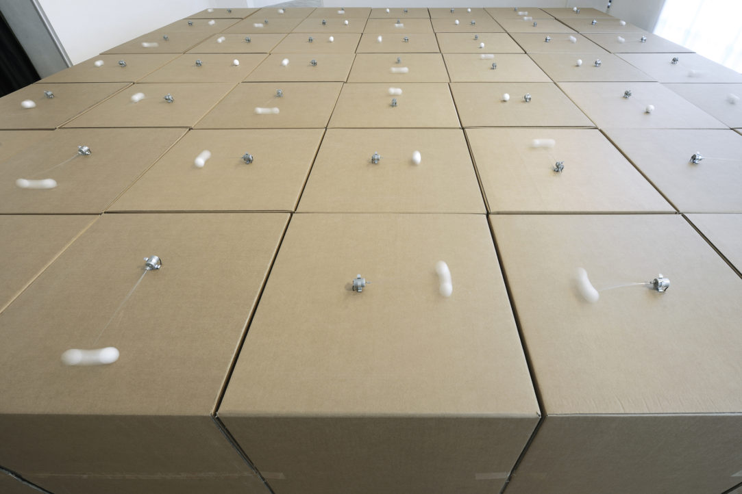 Si apre il 22 ottobre nell’ambito di NODE festival (manifestazione che da 8 anni si dedica all’incontro delle arti visive con la musica, le arti performative, il cinema e le nuove tecnologie), 605 prepared dc-motors, cardboard boxes, prima mostra personale in un museo italiano dell’artista svizzero Zimoun, noto per le sue opere che uniscono sound art e architettura degli spazi. La mostra, a cura di Filippo Aldovini, rimarrà aperta fino al 5 marzo ed è organizzata e prodotta da Galleria civica di Modena e Fondazione Cassa di Risparmio di Modena in collaborazione con Associazione Lemniscata e fuse*. L’esposizione coinvolge le cinque sale della Palazzina dei Giardini di Modena, ciascuna delle quali abitata da un’installazione meccanica costruita con materiali semplici – scatole di cartone, sfere di cotone, cavi di metallo, legno, etc. – e corredata da sistemi automatici che generano movimenti e rumori. Complessi organismi viventi in grado di abitare lo spazio in cui vengono allestiti per mezzo di un sottile e mai banale rapporto tra suono e volumetria circostante. Nell’immagine d’apertura: 149-prepared-dc-motors-cotton-balls-cardboard-boxes-60x60x60cm.