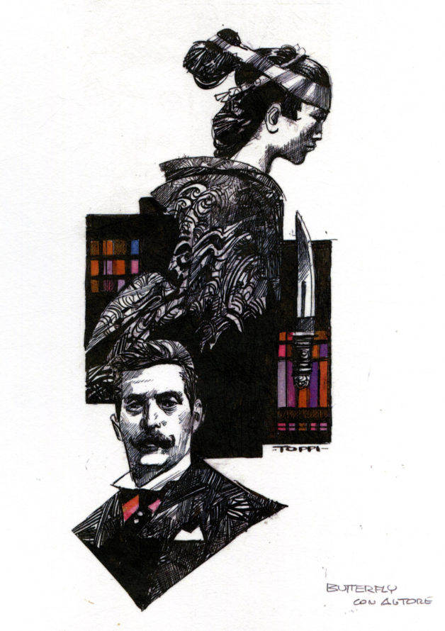 dedicato a Madama Butterfly in occasione della prima rappresentazione dell’opera alla Scala. Magnifiche anche le illustrazioni realizzate dal grande maestro del fumetto Sergio Toppi per celebrare le opere pucciniane, tra cui proprio Madama Butterfly: esposte dieci magnifiche riproduzioni stampate a tiratura limitata. Non manca l’animazione con un poetico spezzone di cartone animato dei Peanuts che ci mostra Piperita Patty pattinare sul ghiaccio sulle note di “O mio babbino caro” (da Gianni Schicchi) fischiettate dall’uccellino Woodstock.