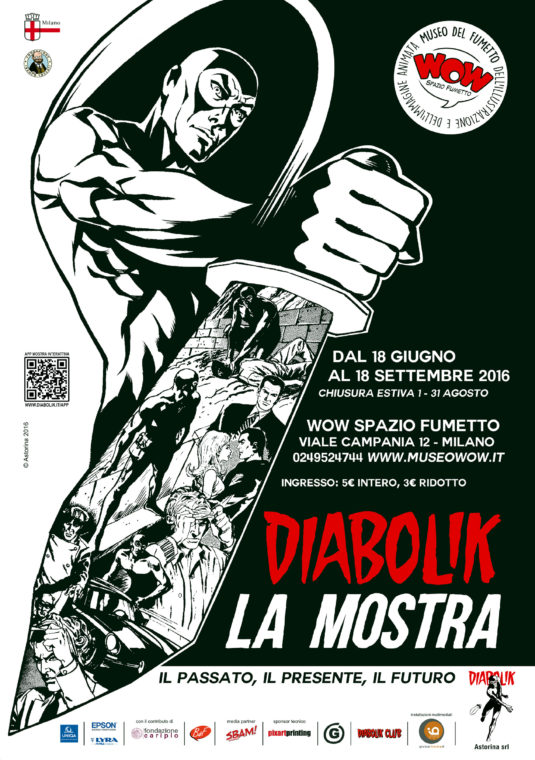 Presso WOW Spazio Fumetto – Museo del Fumetto di Milano si può visitare fino al 18 settembre (ma ad agosto la mostra è chiusa) Diabolik: la mostra – il passato, il presente, il futuro: un grande percorso espositivo che racconta 54 anni di storie attraverso tavole originali, albi d’epoca, pubblicazioni, libri, gadget, memorabilia, ricostruzioni 3D e video. Un percorso che si completa con inserti e approfondimenti multimediali attivabili attraverso l’APP ufficiale Diabolik.it, scaricabile gratuitamente da www.diabolik.it/app/index.php. La mostra si apre con una sezione interamente dedicata ai criminali protagonisti dei classici gialli che hanno ispirato la creazione di Diabolik influenzando generazioni intere di sceneggiatori e disegnatori. Il più noto è certo Fantômas, inquietante personaggio creato nel 1911 da Marcel Allain e Pierre Souvestre, che in una copertina di un’edizione italiana degli anni Cinquanta, presente in mostra, compare vestito con calzamaglia e passamontagna neri. Esposte anche tavole di Carlo Cossio disegnate per illustrare le avventure di un altro grande personaggio “nero” degli anni Quaranta, Za La Mort, oltre ad alcune tra le primissime pubblicazioni della casa editrice Astorina, fondata da Angela Giussani con il prezioso aiuto della sorella Luciana: proprio sulle pagine degli Albi Okey, con protagonista il pugile Big Ben, fanno capolino