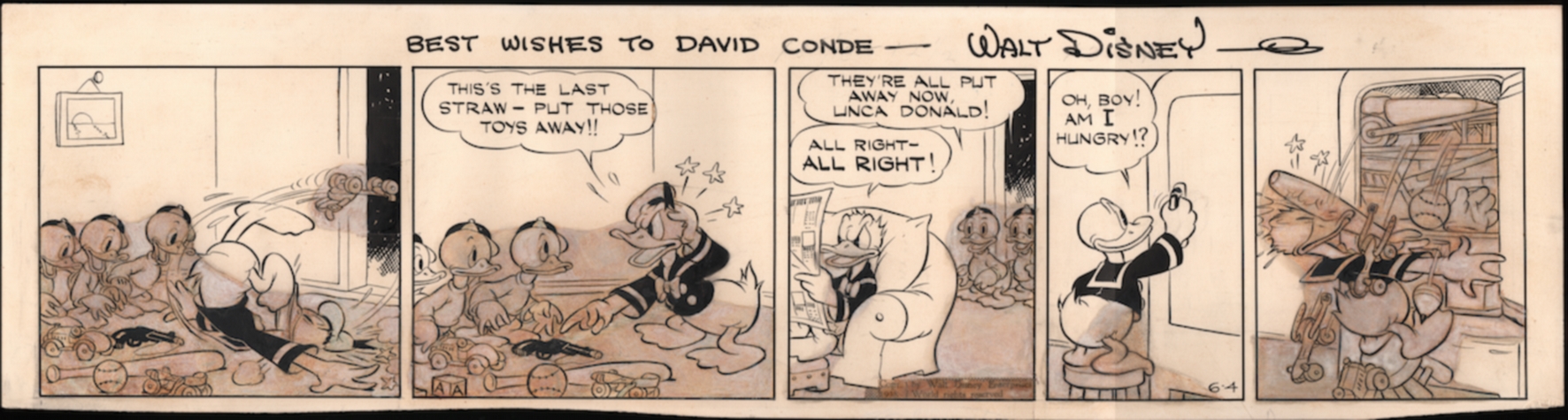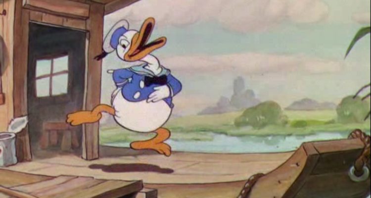 Il 9 giugno 1934 debutta nei cinema statunitensi il cortometraggio d’animazione The Wise Little Hen (La gallinella saggia). Basato su una fiaba molto popolare, la storia racconta di una saggia gallinella e dei suoi tentativi di far lavorare due incorreggibili pigroni, un maiale di nome Meo Porcello e un papero di nome… Paperino. Quella di Paperino dovrebbe essere un’unica apparizione, ma in quel papero c’è qualcosa di speciale. Graficamente è molto diverso dal personaggio di oggi, ha un lungo becco e le sue mani somigliano molto alle ali di una papera, ma subito dimostra di avere un bel caratterino e tutt’altro che privo di difetti; se nella sua prima apparizione si mostra come un incorreggibile pigrone, già nel secondo cortometraggio, Orphan’s Benefit, lo vediamo fare uno dei gesti che lo renderanno famoso, saltellando e menando pugni all’aria, arrabbiato perché un gruppo di monelli sta prendendo in giro la sua performance teatrale. Intanto, in Italia Paperino è al centro di un’evoluzione davvero unica. Nel nostro Paese Federico Pedrocchi, scrittore, disegnatore, responsabile di tutte le testate a fumetti della casa editrice Mondadori (dove lavora dal 1935), è il primo a intuire che Paperino ha delle grandi potenzialità, intitolandogli nel 1937 una testata a fumetti e facendolo, per la prima volta nel mondo, il protagonista assoluto di storie avventurose. Sono le premesse per la nascita della “scuola italiana” del fumetto Disney, autori del nostro Paese che, dalla ripresa nel dopoguerra, si concentreranno soprattutto su alcuni aspetti del suo carattere: costantemente bersagliato dalla mala sorte, Paperino è spesso la vittima dello zio Paperone e del cugino Gastone, sempre destinato al ruolo di perdente.