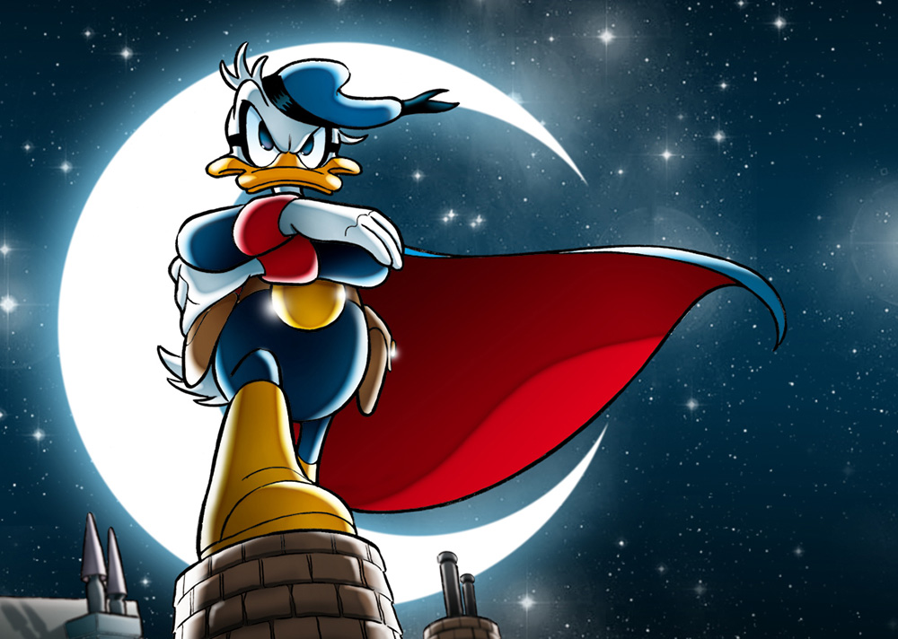 E proprio gli autori italiani, che più di tutti hanno imparato a mostrare le sfaccettature del carattere di Paperino, hanno creato le sue altre identità che vengono raccontate in mostra. Perché si arrivi a un Paperino davvero “a tutto tondo” negli Stati Uniti occorre aspettare il 1942, quando a occuparsi delle sue storie a fumetti arriva un fumettista di nome Carl Barks. In centinaia di storie, Barks espande il mondo di Paperino, gli crea intorno tanti altri personaggi, da zio Paperone al fortunatissimo cugino Gastone, ma soprattutto gli dona un carattere pieno di sfaccettature e contrasti, sempre più simile a quello di ognuno di noi. Negli anni Sessanta, Paperino è un beniamino dei lettori nonostante sia un eterno perdente, e tantissime lettere arrivano alla redazione del settimanale Topolino chiedendo di fare finalmente vincere Paperino, almeno per una volta. Da questo spunto nasce Paperinik, il diabolico vendicatore (1969), in una storia nata da un’idea di Elisa Penna, scritta da Guido Martina e disegnata da Giovan Battista Carpi. Visto il successo riscosso, le storie di Paperinik diventano un appuntamento costante, mentre il personaggio si evolve rapidamente, diventando presto il difensore di Paperopoli, un supereroe mascherato che protegge la città da malviventi e criminali, spesso salvando proprio lo zio Paperone, minacciato da Bassotti, Rockerduck e malviventi vari. Con il passare degli anni il cast si allarga, comprendendo sia altri supereroi, come Paperinika o Tuba Mascherata, sia strampalati criminali: Inquinator, Spectrus e molti altri. Questa evoluzione di Paperinik è la base per un progetto editoriale innovativo. Paperinik diventa PK, in lotta contro crudeli alieni con l’aiuto di un’intelligenza artificiale chiamata Uno. Le storie sono molto innovative per lo stile Disney, con disegni e colori ispirati ai fumetti di supereroi. Nel 2008 invece nasce DoubleDuck, ultima incarnazione del personaggio, questa volta trasformato in un agente segreto, divertente omaggio a 007, una spia che lavora per la misteriosa A