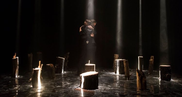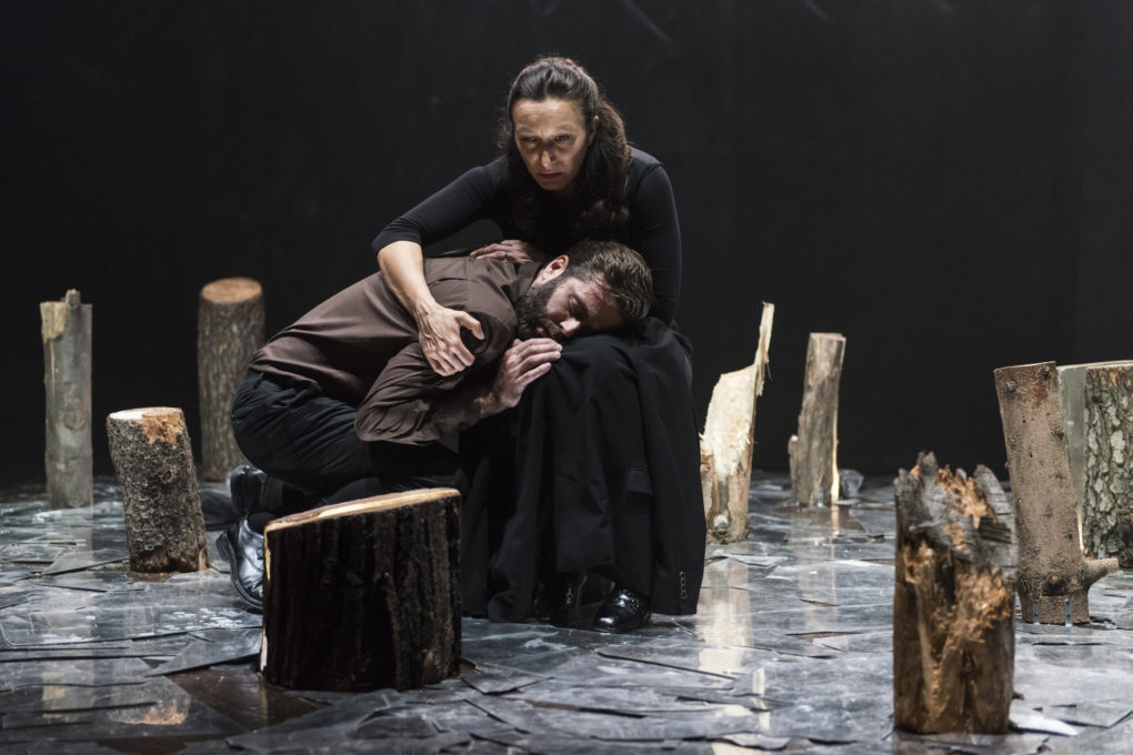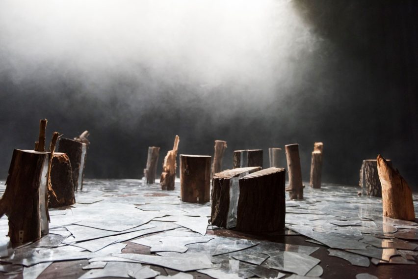 Si, ho chiesto a Maria Spazzi, la scenografa, di realizzare una sorta di memoriale. I tronchi spezzati sono le vite interrotte di questi giovani, gli specchi sono l’immagine polifonica di una società in frantumi. Poi la scenografia restituisce anche l’immagine della Norvegia, la foresta… Ma per me era soprattutto un altare per queste giovani vittime.