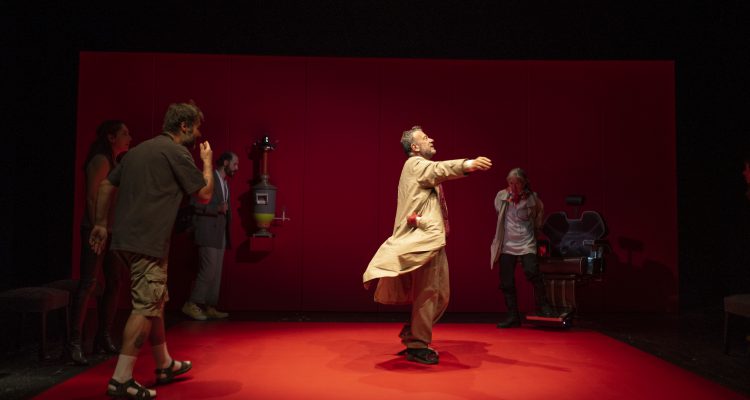 Superficie profondo rosso. Ring e stanza chiusa smaltata cremisi (camera di tortura?), lo spazio scenico concepito da Federico Biancalani per questo Zio Vanja, regia e drammaturgia di Simona Gonella, incastra i personaggi cechoviani in una scena anti-realistica, sottilmente lynchiana, un filo tarantiniana – una stufa e una sedia da dentista sul fondo, qualche panca, un lettino obitoriale a un certo punto, immersi in un monocrome fiammante – in cui la tiepidezza simbolica del samovar (etimologicamente “che bolle da sé”), l’inclemenza minacciosa del temporale, la freddezza degli animi, è surriscaldata, resa elettrica e incandescente dalle scintille che si producono fra questa umanità rinchiusa e perduta, disillusa e frustrata che si agita, paralizzata sul palco. La compresenza forzata somiglia a un consesso di solitudini che si scontrano, una raccolta di ferite che segnano e colorano il paesaggio interiore di un senso vivido di desolazione, disillusione, rimpianto e risentimento. A porte chiuse.