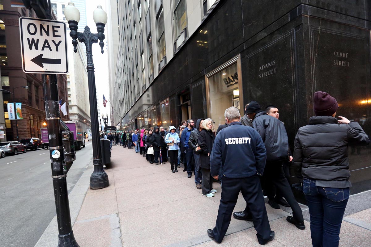 Arrivano da ogni angolo del Paese, sono in fila intorno al ‘blocco’ e vogliono soltanto stare col loro idolo, la loro ispirazione, il loro boss. 30 secondi per dire “grazie” o qualsiasi altra cosa abbiamo mai sognato di dire a Bruce Springsteen. Commossi, composti, scomposti, esaltati, impacciati attendono il loro turno tra Clark e Adams, il cuore finanziario di Chicago. Data addizionale dello “Springsteen’s Born To Run Book Tour”, Chicago si aggiunge alle città americane toccate da Bruce dopo Freehold, New York, Philadelphia, Seattle, Los Angeles, Portland, San Francisco, Cambridge, Cincinnati, Denver, Austin, Kennesaw e Londra, unica tappa fuori porta. C’è Tim che dal 1973 ha visto 178 concerti, c’è la casalinga dell’Ohio che con la ricetta della pumpkin pie alla figlia sedicenne ha passato i dischi di Bruce Springsteen, c’è un ragazzone azzimato che viene dal Canada progressista di Justin Trudeau, ci sono i Thompson, numerosi (e biondi) come i Bradford, che hanno guidato ventidue ore e arrivano dall’Arizona, c’è Harrington, l’adoratore hardcore che vive per procura e poi ci sono io che vengo da Milano e Bruce l’ho visto per la prima volta in fondo agli anni Ottanta. Pochi giorni prima abbiamo strappato un biglietto alla sorte, infilando il primo secondo di vendita e arrivando primi alla cassa digitale. Perché siamo stati a tutti i suoi concerti ma non c’è niente come guardarlo negli occhi, abbracciarlo, baciarlo, sentirlo finalmente vicino e in ascolto.
