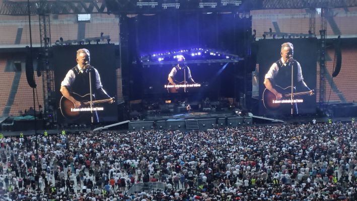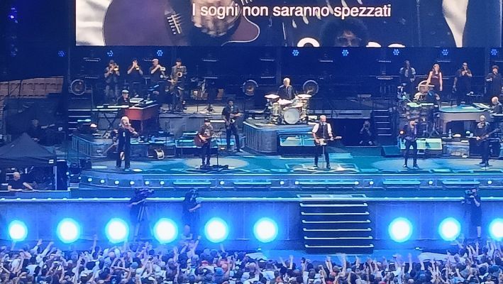 Ma la densità politica dell’European Leg si misura dalla scaletta. Della setlist iniziale i brani rimasti nella lunga marcia da Tampa a San Siro sono 10 su 27/28. Se nella prima parte del tour lo show, con grande spazio alle parti strumentali, ruotava intorno a Nightshift, Kitty’s Back, The E Street Shuffle, Last Man Standing (con il lungo, emozionante speech introduttivo), She’s the One e Backstreets, ora il fulcro sono brani come Land of Hope and Dreams, Rainmaker (che un rabbioso assolo di chitarra di Bruce rende molto più bella della versione da disco), Youngstown, Long Walk Home, House of a Thousand Guitars e My City of Ruins. Tranne Youngstown, a Milano tutte suonate con i sottotitoli in italiano sugli schermi. Come a voler sottolineare l’importanza di quei testi, l’importanza politica, la non neutralità delle scelte e delle canzoni. Da notare che – a parte My City of Ruins nella sua versione ante The Rising – sono tutti pezzi più o meno recenti il cui peso, almeno per chi scrive, è oggi ben maggiore di certi classici (Land of Hope and Dreams e Youngstown live version sono tra le canzoni più belle in assoluto di Springsteen).