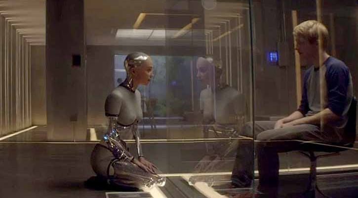 Caleb viene accolto dal suo ospite Nathan (e i nomi biblici non paiono scelti a caso) con cortesia, amicizia e mistero. Dormirà in una stanza senza finestre e avrà una card per aprire le sole porte in cui è amessa la sua presenza. Il suo compito sarà quello di testare l’efficienza del cervello elettronico inventato da Nathan, l’intelligenza artificiale per eccellenza, e stabilire se ha superato il test della perfezione. Da qui la vicenda si dipana attraverso una serie di rivoli interessanti e geniali, sul significato morale di una tale creazione, sui rischi che l’umanità può correre, sul futuro probabile che sta dietro la porta, ma anche sulla natura antica dell’animo umano, ancora ingenuo, violento, assetato d’amore e accecato dai sensi. Fino a che punto si può credere alle parole di un robot? Garland ci mostra come sia facile andare fino in fondo, candendo in tutti i tranelli disseminati sul cammino, anche se questi sono celati solo da vetri e monitor e dispositivi per la visione. Nonostante le sue capacità analitiche e critiche, il giovane protagonista proietta sulla bella Ava le sue fragilità, e si lascia illudere da lei, dall’apparenza della sua innocenza, senza mai pensare all’origine e alla ragione di tanta purezza. Cinema come macchina dello specchiamento e del mito, inteso proprio come congiunzione degli opposti. Tentazione e provocazione, dunque, nel parlare di noi e del nostro tempo in una specie di mondo altro, dominato dal progresso futuribile, che non è fantascienza (come non lo era quella di Moon di Duncan Jones), ma riorganizzazione di dati che ci appartengono qui e ora, grafico ragionato della superbia dell’uomo, che si paragona a Dio e trascura i segni della sua imperfezione. In questo caso il risultato non può essere che di malinconica sconfitta: l’uomo, che è stato capace di creare solo esseri che lo odiano e che hanno imparato dall’umanità soltanto se