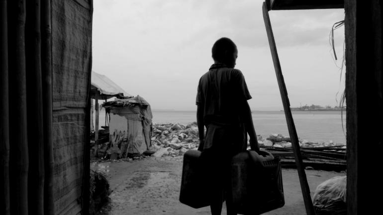 montanti storti, le grate, groviglio di ruggine e cemento, disposti disordinatamente sui marciapiedi per scandire l’ordine intrinseco, profondo, dell’inquadratura di Lav Diaz e allo stesso tempo la libertà della s-composizione, se sullo sfondo si scopre un bambino pienamente a fuoco e in armonia con la molteplicità di forme intorno, che continua le sue scorrerie o il setaccio delle chincaglie, accucciato sulle sue ossa alluvionate; come in una partitura da cui emerga a un tratto un singolo motivo che poi scopri essere completamente integrato con il corale, il grosso dell’armonia e viene sommerso dall’orchestra pur restando distinto. Si tratta del rapporto segreto tra i piani di questa immagine stratificata, profonda (i piani dentro un piano complesso): tra quello che è in primo piano, un bandone ritorto, un palo, un ricettacolo e quello che si dis-ordina in adiacenza e dietro, l’acciottolato, a sinistra una pozza argentina, poi cumuli, capanne, calcinacci, una donna che rovista, la punta degli alberi, cielo pastoso, cumuli.