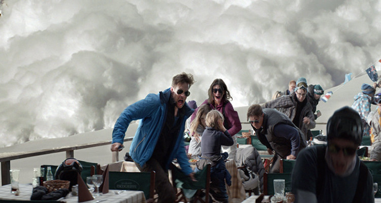 Tomas, Ebba e i loro due biondissimi figli Vera e Harry sono una sana e borghese famigliola svedese, amorevole e apparentemente solidissima, in vacanza sulle alpi francesi. Neve, sole, sci, skilift, legni morbidi e asciugamani candidi, stanze anodine in paesaggi mozzafiato. Il film ce li presenta vestiti di tutto punto per una sciata, in posa per un fotografo che li manovra, quasi a voler cogliere la gioia del relax, la felicità intrinseca del loro stare insieme ottenendo però pose forzate che già odorano di rigor mortis. Durante un pranzo sulla terrazza di un ristorante, di fronte al profilo dei monti, avviene l’inaspettato: una valanga, forse creata a effetto per l’emozione dei turisti, esce dal controllo e sembra abbattersi sui tavoli, istillando il panico in una situazione di calma apparente. Come si deve reagire di fronte all’imprevisto? L’aspettativa (nostra e di chi ci sta accanto) imporrebbe di rispettare i ruoli che interpretiamo ogni giorno: la protezione responsabile, la gerarchia dei sentimenti, la priorità dell’incolumità familiare. Nel pulviscolo bianco che tutto inghiotte, Tomas invece fugge, cerca riparo, si dimentica di moglie e figli salvo poi tornare al tavolo e minimizzare, negando l’accaduto come San Pietro rinnegò Cristo. L’equilibrio della famiglia, qui descritto come gruppo amo