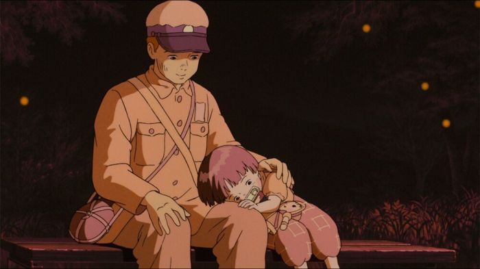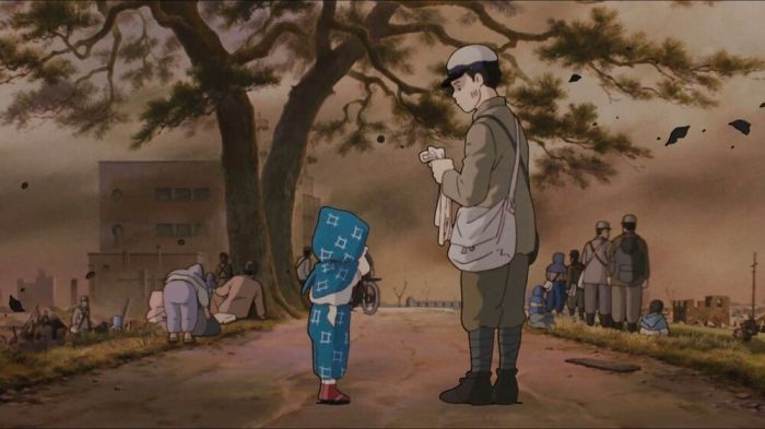 Se le figure restano morbide e “piene” come da cifra tipica dello Studio, il contrasto che si crea con il racconto di corpi martoriati dalle piaghe, dalle ustioni e, infine, dalla malnutrizione, diventa la chiave d’accesso a un mondo alla rovescia. In questo senso, la rimozione che Seita attua rispetto al mondo circostante è simbolo di una condizione paradigmatica: il ragazzo rifiuta di avvicinare l’infanzia della sorellina alla morte, l’ammonisce di non guardare i cadaveri e nasconde a lei e alla zia la scomparsa della madre. E quando la parente gli intima di darsi da fare per servire la nazione, lui rifiuta di essere “educato” e scappa con Setsuko, per creare un suo mondo ribaltato, dove l’infanzia possa esprimersi in barba a quanto succede là fuori. I bombardamenti da cui tutti scappano diventano per lui l’occasione euforica di razziare le case, tutte le sue azioni sono “al rovescio” rispetto all’ordine degli eventi, che comunque arriverà a esigere il suo tributo di amara realtà. Sebbene alcune letture abbiano insistito sul film come resoconto dell’immaturità del ragazzo – che rifletterebbe una visione pessimistica dell’autore rispetto ai giovani giapponesi – in realtà l’aspetto più interessante è il contrasto che si viene a creare fra la bolla che Seita crea (per sé e per la sorella) e una Storia che va avanti e instaura una dialettica dolorosa con una società (quella giapponese) che ha un rapporto complesso con la memoria dei fatti accaduti durante la Seconda guerra mondiale – il film non a caso fu presentato come un “oggetto smarrito”.
