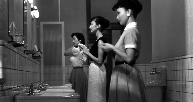 Una nuova perla della filmografia conosciuta di Ozu si è aggiunta alla lista delle sue opere restaurate e riconsegnate alla visione del pubblico. Speriamo presto possa arricchire anche quelle disponibili per il pubblico italiano, che nel 2015 ha visto in distribuzione sei film ad opera della Tucker Film. Un’operazione di crowdfunding che portò anche alla realizzazione di un cofanetto con libro allegatoche continua a essere una delle migliori proposte nel pigro mercato italiano (a Bologna anche per questo si consegnano, per ogni edizione de Il Cinema Ritrovato, i Dvd Awards ai migliori dvd e Blu-ray, con finalisti da tutto il mondo ma raramente made in italy). Inizio di primavera, del 1956, si inserirebbe bene in questo cofanetto, tra il secondo e il terzo titolo. È infatti successivo a Viaggio a Tokyo del 1953, il più noto di tutti, e precede solo di un altro Fiori di equinozio (1958) che apre il ciclo di film a colori, della seconda metà degli anni cinquanta. Film in gran parte incentrati, come Inizio di primavera, sulla vita degli “madogawa-zoku”, alla lettera “gli impiegati che siedono accanto alle finestre”. Un ciclo di opere che andrebbe considerato simili a “variazioni musicali”, operazione unica nella storia del cinema, così riuscita e monumentale da poter reggere questa similitudine solo con le Variazioni Goldberg di Bach. Di Yasujirö Ozu si conservano solo 37 film su 52, e quelli persi riguardano i primi dieci anni, dopo l’esordio del 1927. Inizio di primavera è il 47.mo ed è anche il penultimo film in bianco e nero del regista giapponese. Nonostante lo splendore dei suoi film a colori, di questo non se ne sente la mancanza. Insieme alle sfumature ricchissime di grigio degli abiti femminili, la serialità dei toni delle camicie bianche degli impiegati si accorda perfettamente con l’insolita coralità del soggetto del film. E non è l’unica novità di questo film poco conosciuto di Ozu, a cominciare dalla sua durata di oltre due ore e venti, molto oltre i canoni di Ozu.