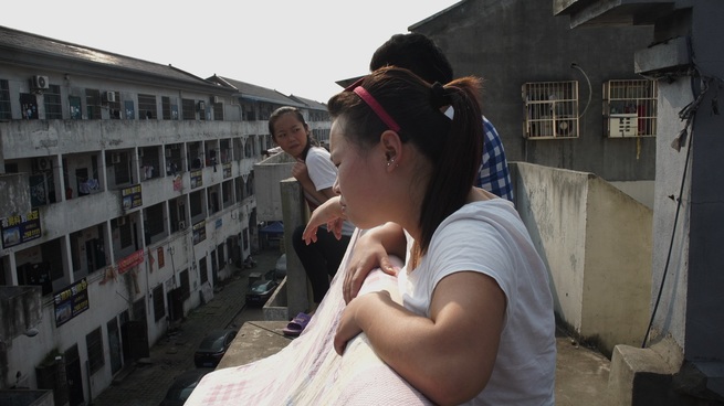 Il pre-testo è semplice, riassumibile in pochi dati posti prima dei titoli di coda ma dopo l’ultima immagine, come a dire: è importante contestualizzare, ma lo è ancor più non spiegare subito allo spettatore la fonte, anche perché quel disagio sociale profondamente contemporaneo e cinese, quel volere fare soldi a tutti i costi, è un disagio che, nella diversità dei modi, coinvolge il mondo intero. A Huzhou, definita dal regista “una delle città più frenetiche della costa orientale cinese, dove c’è il più alto numero di lavoratori part-time”, nella provincia dello Zhejiang, ci sono 18.000 officine private di abbigliamento nelle quali vi lavorano oltre 300.000 operai venuti dalle zone rurali di altre province. Da una di queste, lo Yunnan, arrivano tre giovani che abbandonano temporaneamente la famiglia con l’obiettivo di guadagnare più denaro nel più breve tempo possibile. Troveranno una moltitudine di persone come loro, sottopagate e attente a non entrare nella rete di società che promettono guadagni facili in cambio di investimenti. Wang Bing le racconta, sta in mezzo a quelle donne e quegli uomini, diventa, lui e la sua macchina da presa, uno di loro, e tale complicità la dichiara rompendo la parete invisibile tra ciò che sta in campo e si vede e ciò che sta fuori campo ed è nascosto. Una delle donne (la persona/personaggio indimenticabile del film, che parla dei maltrattamenti subiti dal marito, che poi in una scena filmata in un lungo piano sequenza la picchia ripetutamente nel loro piccolo negozio di fronte a dei testimoni perché lei non vuole andarsene da casa dopo esservi stata cacciata) si rivolge a chi sta filmando invitandolo a seguirla per vie strette e buie. Altrove, l’ombra di chi filma, mentre sta seguendo un uomo su una scala, è riflessa sul muro, errore che si fa segno teorico. Due sorelle invitano chi filma ad avvicinarsi per fargli vedere su un cellulare fotografie del loro villaggio.