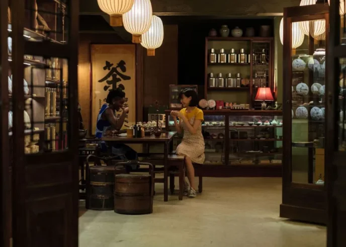 I personaggi di Abderrahmane Sissako sono sempre stati viaggiatori, quasi a voler dire fin da subito che la dimensione stanziale non si addice al (suo) cinema. Dieci anni dopo Timbuktu ci racconta, infatti, degli incontri di una donna che ha deciso di lasciare la Costa d’Avorio per la Cina. Black Tea inizia con un matrimonio negato e una fuga. Senza soluzione di continuità, Aya, lasciato dietro di sé il quasi marito traditore, approda in Cina, a Guangzhou, in un quartiere chiamato Chocolate City, per la presenza massiccia di africani di tanti paesi diversi. Parla cinese e lavora nella bottega di tè gestita da Cai, che gli insegna con passione, l’arte di assaporare il tè e la sua storia infinita. L’atmosfera è rarefatta, i piani si distendono ai nostri occhi con necessità di tempo e di riflessione, le immagini si moltiplicano nel quadro grazie a continue sovrapposizioni e riflessi, al gioco delle trasparenze attraverso i vetri e le luci. Non è l’Africa dei colori pieni e delle immagini assolute. Qui le linee sono orizzontali, l’attesa e i gesti ovattati, lenti e precisi, rappresentano la meditazione nella sua forma concreta. E qui Aya ha una nuova vita piena di studio e consapevolezza, la stessa che esprimeva nella camminata con cui si allontanava dalla sua vecchia esistenza e si avvicinava alla nuova.