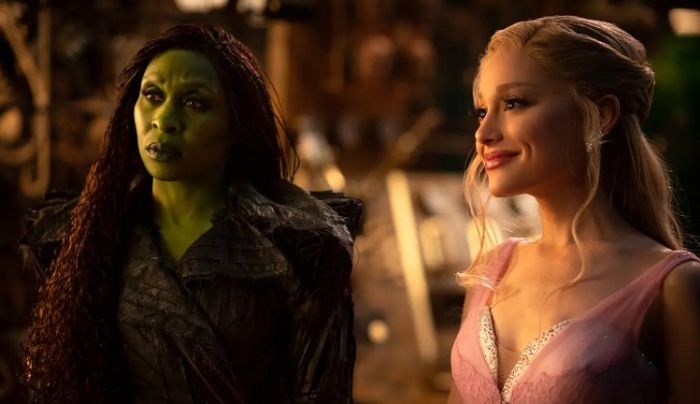 Dietro al successo dell’operazione c’è ovviamente Platt che già nel 2003 produsse il musical originario di Broadway, e da questa clamorosa esperienza si è ripartiti: la vicenda del musical originario è liberamente adattata dal romanzo di Gregory Maguire Strega – Cronache dal Regno di Oz in rivolta (1995): a tutti gli effetti prequel de Il mago di Oz, racconta il vissuto drammatico della detestata, verde, cattiva strega dell’Ovest e della sua amica/nemica, rosa e sbrilluccicante, la strega Glinda. Il libro di Maguire offriva una riflessione sulla natura della cattiveria e sulle circostanze che determinano il corso degli eventi e l’avvenire dei soggetti della scena umana; il musical adotta il revisionismo del punto di vista, semplificando e concentrandosi sul rapporto di attrazione e repulsione di due opposte e contrarie espressioni della natura umana: essere viste e detestate come l’outsider dalla pelle verde, studiosa e dotata di grandi poteri magici (Elphaba, Cynthia Erivo, già intensa interprete di Aretha Franklin in Genius) o essere amate e esaltate come creature irresistibili, un po’ inconsapevoli e un po’ spericolate, vittime e artefici di una celebrità da prime della classe che lascia sole (Glinda, Ariana Grande che sguazza abilmente nella parte) rinchiuse nel guscio delle proprie inscalfibili sicurezze e arroganze.
