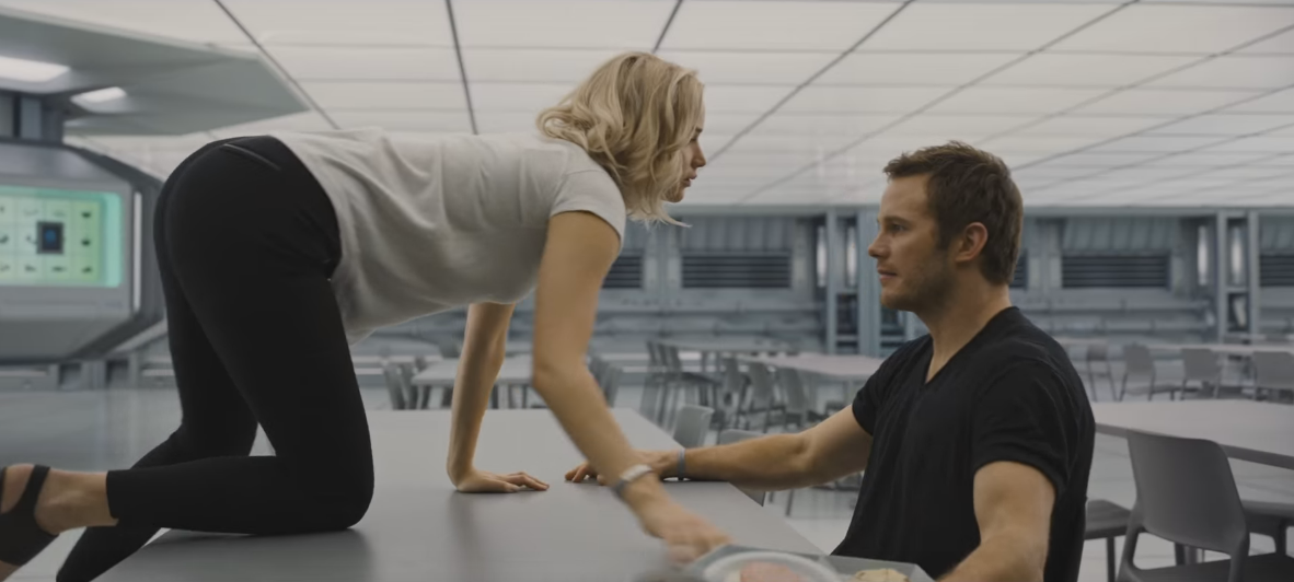 Luoghi comuni a profusione, citazoni, sviluppi prevedibili, complicazioni inutili si susseguono secondo uno schema elementare, che non prevede l’approfondimento dei personaggi, descritti solo per quel poco che serve a proseguire la storia. Lui meccanico di terza classe, lei scrittrice annoiata con tutti i benefit, ricordano i protagonisti di Titanic, salvo che manca ogni personalità nello sguardo di Morten Tyldum, disinteressato a tal punto alle loro sorti da farli sfilare, annoiatissimi, come intrappolati in un reality. L’immaginario cinematografico cui attinge, e che potrebbe essere un valore aggiunto, si riduce presto ad una semplice ripetizione in