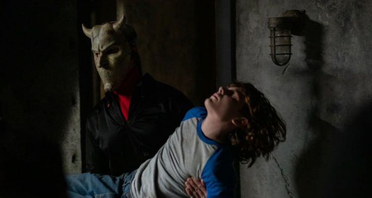 Se quindi non mancano le figure retoriche tipiche del genere (la soglia che divide dalla tana del mostro, le apparizioni improvvise nel buio), il film riesce a toccare alcune corde più profonde, lasciando assaporare il disagio dell’improvviso sovvertimento della normalità, che diventa cartina di tornasole per leggere il mondo: la prigione di Finney diventa quindi uno spazio “liquido”, che snocciola nuovi ambienti senza soluzione di continuità. Lo stesso vale per la casa “di sopra” in cui si muove il mostro, un Ethan Hawke quasi sempre coperto dalla luciferina maschera che, smontata e rimontata alla bisogna, ne ridisegna continuamente il volto e le espressioni, rendendolo ora grottescamente allegro, ora triste, ora arrabbiato. La dimensione soggettiva ingloba così la materialità degli elementi oggettivi per riscrivere continuamente la progressione del racconto. Lo spettatore resta sanamente confuso e