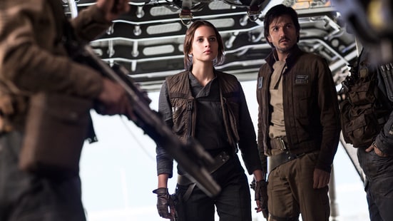 Pochissimo tempo prima degli eventi narrati in Star Wars – Episodio IV – Una nuova speranza (che per chi scrive è ancora il buon vecchio Guerre stellari) e molto dopo Star Wars – Episodio III – La vendetta dei Sith, lo scienziato imperiale “pentito” Galen Erso (Mads Mikkelsen) si ritira con la moglie Lyra e la figlia Jyn su un pianeta lontano ma viene raggiunto dal Direttore Imperiale Krennic (Ben Mendelsohn) che ne uccide la consorte per riportarlo alla progettazione di una stazione spaziale/arma di distruzione di massa denominata Morte Nera. Erso riesce a salvare la vita alla piccola Jyn affidandola all’estremista ribelle Saw Gerrera (Forest Whitaker), veterano delle Guerre dei Cloni; e quindici anni dopo, mentre il governatore Tarkin (Peter Cushing, “resuscitato” in digitale grazie alla controfigurazione dell’attore Guy Henry), Krennic e Darth Vader stanno per terminare l’opera grazie al riluttante Erso, l’ormai adulta Jyn (Felicity Jones) si ritrova a capeggiare un gruppo composto dall’ufficiale Cassian Andor (Diego Luna), dal monaco cieco Chirrut Imwe (Donnie Yen) intriso dei dogmi della Forza, dal guerriero Baze Malbus (Jiang Wen), dal pilota disertore Bodhi Rook (Riz Ahmed) e dal droide imperiale riprogrammato K-2SO (Alan Tudyk in performance capture, e credo sia la prima volta che la tecnica viene utilizzata per dare “vita” a un automa) e a rivelare all’Alleanza Ribelle che nei piani di costruzione della Morte Nera il padre ha deliberatamente nascosto una falla. E quando il generale Mon Mothma (Genevieve O’Reilly) decide che non esistono prove sufficienti per avallarne il piano di recupero, Jyn e i suoi decidono di fare di testa loro: rubano una nave, adottano il nome in codice Rogue Uno e portano sacrificalmente a compimento l’operazione da soli. I dati conquistati arriveranno dritti nelle mani della principessa Leia Organa. Sì, per sommi capi è così.