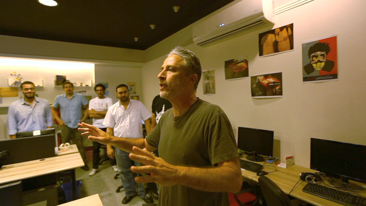 La filmografia dedicata alle rivolte popolari esplose in alcuni paesi arabi dal 2010-2011 ha raggiunto, nel volgere di poco più di un lustro, una quantità enorme di titoli concentrata soprattutto su quanto accaduto in Tunisia e in Egitto. Film documentari, ma anche di finzione, sorti dall’urgenza di testimoniare “in diretta” uno stato delle cose in costante e imprevedibile mutazione. Film realizzati da produzioni e cineasti locali, da registi e troupe internazionali, testi variabili per durata, approccio narrativo e estetico. Tutti – quelli divenuti maggiormente visibili per via anche di una confezione (documentaria) più convenzionale, destinata a una meno ardua distribuzione, così come quelli inscritti in un modo di fare cinema più militante e underground – accomunati dalla necessità di registrare uno o, come nel caso dell’Egitto, più passaggi epocali nel giro di pochi anni. Per comporre una pluralità di punti di vista, un puzzle visivo in cui ogni pezzo (ogni film, ogni materiale) contribuisce a raccontare e ad arricchire un’attualità, una cronaca che è già, al tempo stesso, Storia. A questa filmografia espansa e in continuo aggiornamento si è aggiunta, negli ultimi mesi, Tickling Giants (traducibile con Facendo il solletico ai giganti), solida produzione americana realizzata da Sara Taksler, al suo secondo documentario ma soprattutto produttrice televisiva del programma satirico The Daily Show condotto dalla star comica Jon Stewart (spettacolo e attore che in Tickling Giants rivestono un ruolo tutt’altro che marginale).