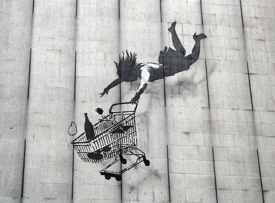 ripreso la metro e sono scesa a Camden Town, che è in assoluto una delle tappe preferite degli artisti di strada e che dal giorno della mia visita è diventata tale anche per me, per i suoi edifici eccentrici e il suo gusto kitsch. Aggirandomi per Kentish e Camden Road alla ricerca di qualche Banksy, mi sono imbattuta in diversi lavori. Ciò che trasforma un semplice schizzo sul muro in un’opera d’arte è il messaggio che viene trasmesso, e ho trovato questi graffiti estremamente ben fatti dal punto di vista tecnico, ma forse un po’ poveri in termini di linguaggio. Quando poi sono arrivata a Jeffrey’s Street, con mia enorme delusione ho notato che quello che doveva essere il Tox Bubble Writer, altro capolavoro di Banksy, oggi non è altro che una colata di intonaco bianco. Stavo cercando qualcosa di più profondo, con più riflessione, più sentimento. Così non mi sono arresa, e ho optato per Oxford Circus, uno dei quartieri più cool di Londra. Lungi dall’essere un semplice concentrato di negozi e locali all’avanguardia, esso mi ha finalmente offerto ciò che stavo disperatamente cercando: sulla facciata di un alto palazzo di uffici in disuso, ho potuto ammirare The Falling Shopper. Banksy ha scelto di rappresentare una giovane donna che precipita dall’alto con il suo carrello del